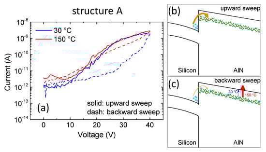 For structure A (Figure 6a), the upward current was higher than the backward current (positive shift). This indicates that electrons that were injected from Si into AlN were trapped at defects in the AlN nucleation layer (Figure 6b). However, this effect was weaker at high temperature, leading to a considerably reduced hysteresis, possibly due to a thermally-assisted de-trapping process [] compatible with the presence of a donor-like trap like oxygen in V-pit traces. In other words, at high temperature there was a lower amount of trapped charges during the backward sweep with respect to the room temperature condition (Figure 6b,c).
