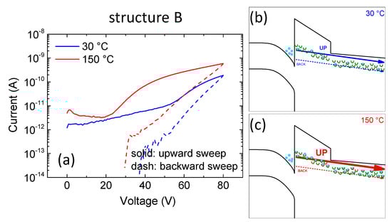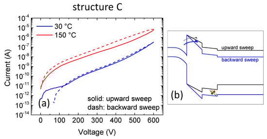 In contrast to all other samples, sample C showed a negative shift (Figure 8a), i.e., a higher current was measured for the backward sweep, especially at high temperature. This effect was ascribed to the presence of positive charges (holes) trapped in the buffer. We suggest that holes flowed from GaN:C to the GaN:C/AlGaN heterointerface. Due to the valence band discontinuity, part of these holes may have been trapped there, thus modifying the band diagram as schematically represented in Figure 8b. This resulted in a higher current during the backward sweep. A high temperature enhanced this phenomenon, thanks to the higher number of holes available.