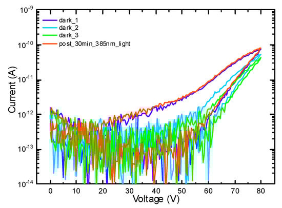 Figure 6 and Figure 7 show the presence of considerable electron trapping in the AlN and AlGaN layers. To characterize the traps which caused the experimentally observed hysteresis in the IV characteristic of structure B, we analyzed the effect of UV light with a wavelength of 385 nm on vertical leakage and charge trapping. For this, we performed I–V characterization before and after exposing the sample to UV light for 30 min.
