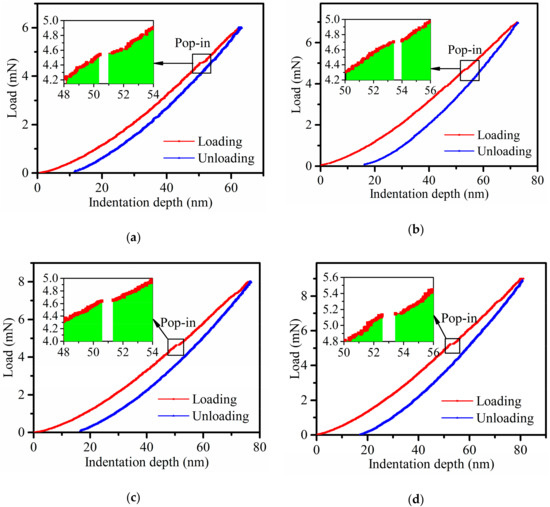 - Han, J.; Sun, J.; Xu, S.; Song, D.; Liu, H.; Han, Y.; Fang, L. Deformation mechanisms at multiple pop-ins under spherical nanoindentation of (1 1 1) Si. Comput. Mater. Sci. 2018, 143, 480–485. [Google Scholar] [CrossRef]