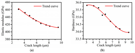 - Both the values of elastic modulus and hardness decrease as the crack length increases, because the crack extension increases the projected contact area Ap. In order to obtain more accurate mechanical property values in nanoindentation tests for brittle materials like SiC, an appropriate load for avoiding surface cracks should be adopted.