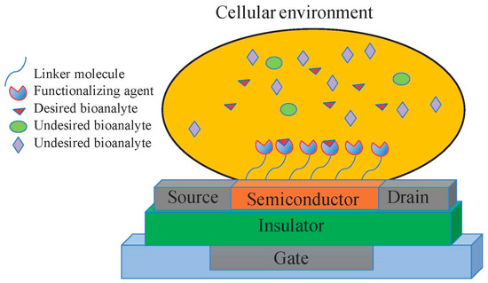 A transistor-based biosensor. An example of a medical electronic device where semiconductor materials interact directly with cellular environment. In this case, functionalizing agents for a desired bioanalyte are attached to the surface of the transistors using appropriate linker molecules. The active layer of the transistor including the semiconductor materials are in contact with cellular environment to real-time monitor and control the environment. The selection of correct functionalizing agent may lead to high selectivity of the device by detecting only the desired bioanalyte. Upon detection of the bioanalyte, the electronic characterizations of the active layer may change and consequently the amount of target bioanalyte is related to the variation in transistor performance (i.e., current-voltage graph). The interaction between the semiconductor layer and cellular environment necessitates the use of biocompatible materials to enable the use of the medical electronic device for cells and tissues.
