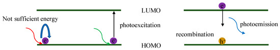 Energy band diagram, photoexcitation, and photoemission. (Left panel): Photons with low energy (large wavelengths) cannot excite an electron, whereas photons with higher energies (shorter wavelengths) can. Upon photoexcitation, electrons are transferred from the highest occupied molecular orbital (HOMO) to lowest unoccupied molecular orbital (LUMO) leaving holes in the HOMO. (Right panel): If no electronic interactions occur during the very short lifetime of an electron in the LUMO, it returns to the HOMO and emits a photon (radiative electron-hole recombination).