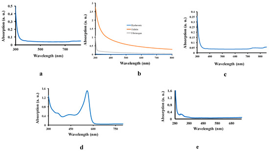 Absorption spectra of different materials (a) glycerol, (b) hyaluronic acid-gelatin-fibrinogen, (c) a closer look at hyaluronic acid, (d) the absorption spectrum of cell culture medium, Dulbecco’s modified eagle medium (DMEM). The rise in the absorption starts at 630 nm (equal to 1.96 eV). This means that photons with larger wavelengths (i.e., lower energies) cannot provide sufficient energy to excite electrons. (e) the absorption spectrum for phenol red-free DMEM does not show any rise above 400 nm.