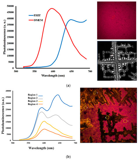 where σE, σt are the expectation value of the energy operator in the state ψ and the lifetime of the state ψ, respectively. This indicates that excited states like the LUMO would have extremely short lifetimes. As such, if there is no electronic interaction to remove an excited electron from the LUMO, it returns to the HOMO and emits a photon. This recombination can be detected using PL that measures the number of emitted photons (Figure 2). Therefore, the peak in the PL graph implies a high number of electrons that move back to the HOMO and recombine with holes. However, if the electronic system includes both electron donor and acceptor materials (p- and n-type materials), the excited electron can be transferred to the acceptor. This electronic transfer would decrease the number of recombinations and quench the PL spectrum. Therefore, using the PL measurements of the material system in conjugation with a known polymer, one can verify if the material shows such electronic interactions (charge separation). Here, we used P3HT, a well-known p-type organic material that is used as an electron donor in electronic device fabrication. Such systems are modeled as donor-acceptor heterojunctions. Depending at the energy levels of the HOMO and LUMO of the two materials, the electrons and holes become separated; electrons fall into lower energy states and holes rise to higher energies [34,35]. Such charge separation decreases the radiative recombination. The heterogeneous charge transfer and PL quenching has been observed in a variety of organic or inorganic semiconductor systems applied for optoelectronics and solar energy conversion systems [36,37]. We investigated the optoelectronic properties of the biomaterials in our current study. Therefore, the observed PL quenching in our experiment is attributed to interfacial charge separation at the phenol red-P3HT junction. In the scenario that both electrons and holes are injected into the same material (provided that the relative energy levels of the two materials allow such charge transfer), the concentrations of the carriers in one material can increase, resulting in higher PL. This is similar to the process that occurs in quantum well-based light-emitting diodes. Figure 4 shows the confocal PL mapping and PL spectra of single-layer P3HT as well as a bilayer film of P3HT and biomaterial. The PL spectrum of the P3HT layer shows a characteristic peak at 630 nm. The PL map also shows uniform photoemission over a large area (scan area 1.4 × 1.4 mm2). In the bilayer film of medium/polymer, four different regions were investigated to verify the effect of electronic interactions. Figure 4a shows the confocal images of P3HT and DMEM as well as their PL spectra. In Figure 4b, the PL spectra for regions 1 and 2 show peaks at 580 and 630 nm representing phenol red and P3HT, respectively. As shown in Figure 4b, the amount of medium in region 2 is higher than that in region 1; therefore, the peaks for both phenol red and P3HT are smaller in region 2 owing to more electronic interactions among molecules. It is worth noting that the medium and polymer interaction in regions 3 and 4 can quench the peak for P3HT completely. The quench in the PL spectrum for bilayer film confirms the electronic interaction between the P3HT and biomaterial. With the charge separation between the biomaterial and P3HT; the number of recombinant electrons in the P3HT drops, and the PL spectrum thereby quenches.