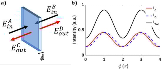 Our optical system consists in two counter-propagating continuous waves (CW) impinging on a homogeneous ENZ film, and , respectively, at normal incidence (Figure 1a). From the transfer matrix method (TMM), we calculate the electric field at the two outputs of our symmetric system, and respectively. By changing the relative phase between the two counter-propagating beams, we simulate the scenario in which the film is shifted along the propagation direction and calculate the intensity of the two outputs, C and D (Figure 1b). By summing the intensity at the two outputs (), we define the modulation visibility of the total energy as