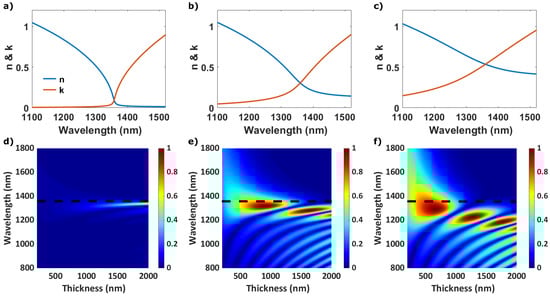 In the ideal case without losses, the first resonance of an FP cavity is reached when the . Due to the strong gradient of the n before the ENZ region, the at which the first resonance occurs will not scale linearly with d, but it will be locked in this spectral range with strong dispersion. Moreover, in a lossy dielectric medium, r and t become complex and their phases depend on the value of both n and k of the lossy medium. Here the first resonant order for the FP cavity is reached when , where is the phase of the transmission coefficient []. Combining the strong dispersion of n due to the ENZ condition and the value of k, almost perfect modulation of absorption is expected at wavelength just below even for subwavelength thickness (Figure 2f).