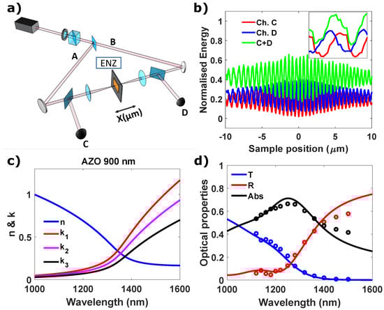 (a) Schematics of the Sagnac interferometer. (b) An example of measurement for = 1280 nm, assuming energy equal to 1 at the interferometer input. The total modulation of the energy (or absorption) is given by the sum of C and D (green curve). The inset shows a zoom of the interferogram. (c) ellipsometer measurement of the index of refraction of AZO 900 nm thick film, (d) experimental (dots) and TMM simulation (solid line) of R, T and abs for the same sample.