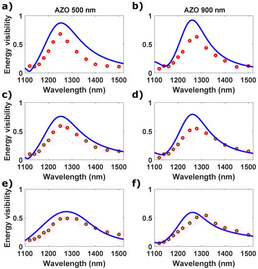 Experimental (circles) and transfer matrix method (TMM) simulation (solid line) of normalized visibility of the total energy for aluminum-doped zinc oxide (AZO) 500 nm and 900 nm with different values of k. (a,b) High losses , (c,d) middle losses and (e,f) low losses . For the TMM simulation we suppose 60 nm.