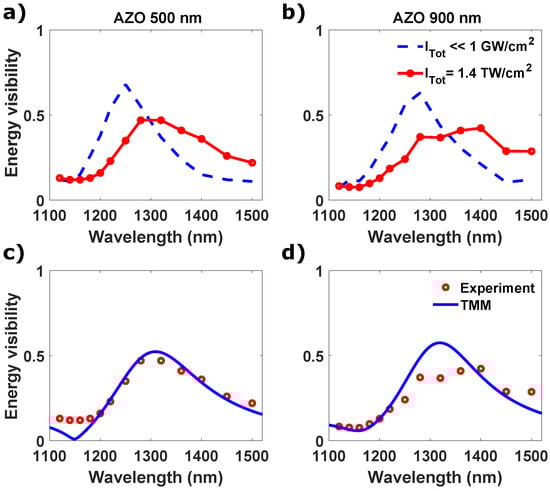 (a,b) Normalized visibility of the total energy for both samples, 500 nm (a) and 900 nm (b). The dashed blue curve represents the linear characterization, while the circles is the nonlinear CPA with high beam intensity. (c,d) Experimental (circles) and TMM simulation (solid line) of normalized visibility of the total energy for AZO 500 nm and 900 nm for the nonlinear CPA.