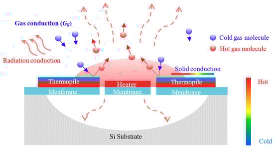Heat dissipated from the heater membrane to the silicon substrate via thermal conduction through the membrane structure as well as flow convection through collisions of the surrounding gas molecules. Radiation will contribute to the total thermal conductance only in the case of a high temperature and is omitted here []. Figure 1 presents the sensing scheme of the proposed thermoelectric-type sensor under the three forms of heat transfer.