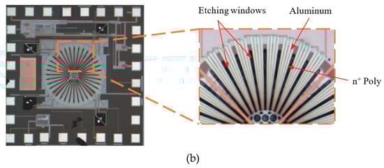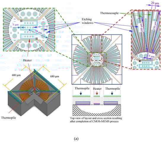 A complementary metal-oxide-semiconductor (CMOS)–MEMS has proven particularly effective in the development of SOC technology, due to the maturity of the processes and its compatibility with standard CMOS technology [,,]. Thermal micro-sensors for the measurement of vacuum pressure have proven highly effective in terms of pressure range, accuracy, and reliability [,,,,,], and this in turn has prompted efforts to develop these devices using CMOS–MEMS technology to facilitate installation [,].