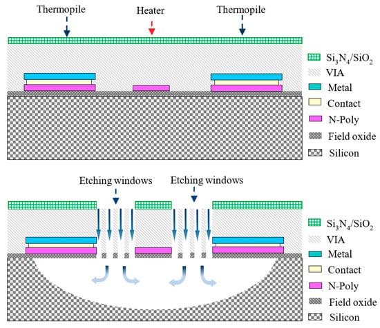 The performance of the thermal-type pressure sensor is promoted by reducing the heat conduction and increasing the contribution of the gas convection. This was achieved by a number of etching windows (length = 200 μm; average width = 4.8 μm) in the active area to allow the etchant to flow through the etching windows efficiently, which was helpful in realization of a freely suspended microstructure. After the CMOS processes, a series of post-processes, including an isotropic RIE (Reactive ion etching) and wet etching processes, also were used to remove the silicon beneath the sensing structures. Figure 3 illustrates the steps used to fabricate the thermoelectric-type vacuum sensor with active heater.