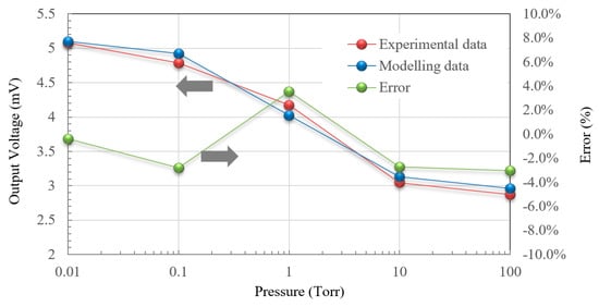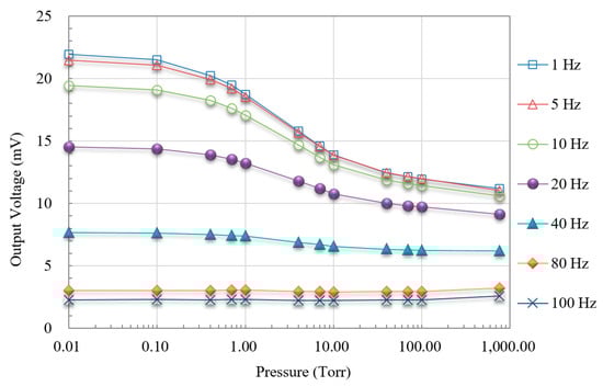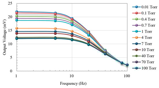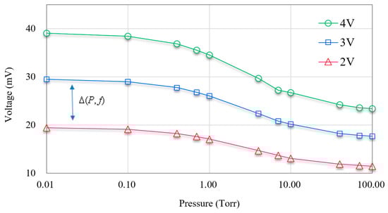 Note the equal spacing between the output voltage curves exists among the entire pressure range (0.01–100 Torr), indicating that these results correspond with the theoretical values derived using Equation (14).
