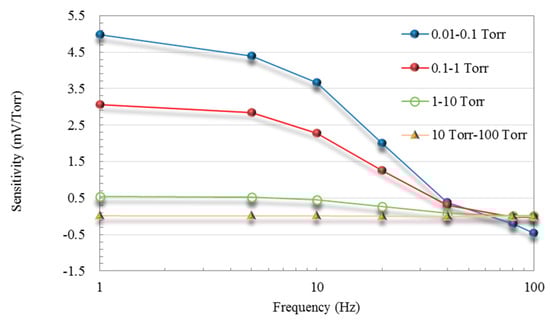 Figure 5, Figure 6, Figure 7 and Figure 8 show that under medium-vacuum conditions (i.e., 25–10−3 Torr), the proposed sensor provided good sensitivity and resolution when modulating the frequency to less than 10 Hz.