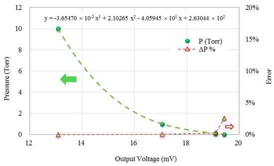 Moreover, it is important to evaluate the performance of the proposed vacuum measurement scheme via the error analysis. The calibration for vacuum measurement was kept with an appropriate heating frequency setup at 10 Hz. The measurement with low frequency near a DC condition was easy to affect by ambient temperature and background noises. Figure 9 presents calibration curves as a function of output voltage, as an indicator of error performance, with the heating frequency set at 10 Hz across a range of vacuum conditions. Between 0.1 and 10 Torr, the degree of error was consistently below 0.25%, which shows an excellent characteristic curve for measurement. Meanwhile the maximum degree of error was 2.59%, which happened at 0.01 Torr.