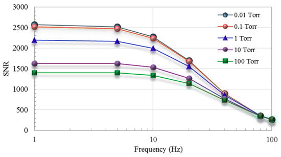 Figure 10 presents signal-to-noise ratio (SNR) curves in the range of 0.01–100 Torr. To calculate the SNR values, the original output signal and Johnson’s noise from the thermoelectric elements were adopted. The SNR values increased with a decrease in frequency, from >1138 (at 20 Hz, 100 Torr) to 2568 (at 1 Hz, 0.01 Torr). Seen at frequencies below 20 Hz, the sensitivity was also significantly higher. Based on asymmetrical applied heating (i.e., setting Voff) to the active heater, these results indicate that the proposed sensor operates more effectively under a lower first harmonic modulation frequency. Table 2 summarizes the performance parameters of the proposed thermoelectric vacuum sensor.