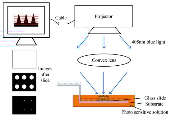 - Li, D.; Miao, A.; Jin, X.; Shang, X.; Liang, H.; Yang, R. An automated 3D visible light stereolithography platform for hydrogel-based micron-sized structures. AIP Adv. 2019, 9. [Google Scholar] [CrossRef]