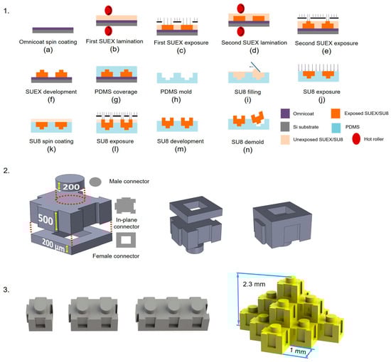 A layer of 15-nm-thick OmnicoatTM was spin-coated on a silicon wafer at 1000 rpm for 10 s for adhesion enhancement. A layer of 500-µm-thick dry-film SUEX epoxy was laminated on the wafer by a hot rolling laminator (SKY 335R6) at 60 °C. The SUEX was patterned using a photolithography process to define the microelements’ in-plane connectors. Then a second layer of 200-µm-thick SUEX was laminated and patterned on the first SUEX layer to define the male connectors. The use of laminated SUEX film offers dimensional uniformity across layers.