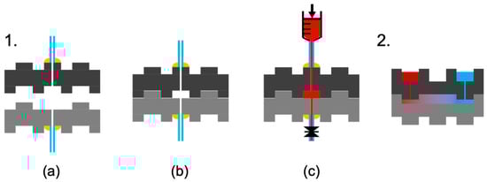 Several approaches have been employed to fabricate modular microfluidics, including microfabrication techniques [,], three-dimensional (3D) printing [,], and micromilling of injection molded blocks []. In modular microfluidics, PDMS or other polymer materials are typically fabricated into separate modules that are later assembled into a multifunctional system as in [,] via a set of predefined connections.