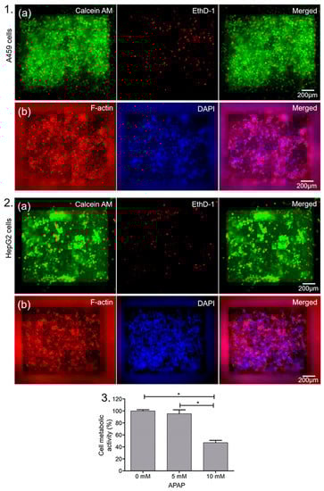 Application of microwell arrays in cell culture and drug testing. (1). Viability of A549 cells within modular microwell arrays on day 4 showing (a) the live (green) and dead (red) cells, and (b) F-actin (red) and nuclei (blue) staining of the cells on day 5. (2). Viability of HepG2 cells within modular microwell arrays on day 4 showing (a) the live (green) and dead (red) cells, and (b) F-actin (red) and nuclei (blue) staining of the cells on day 5. (3). Quantitative metabolic activity of HepG2 cells as determined by the 3-(4,5-dimethylthiazol-2-yl)- MTS assay after treatment with indicated doses of APAP after 12 h of exposure. The asterisk represents statistically significant differences (p < 0.05).