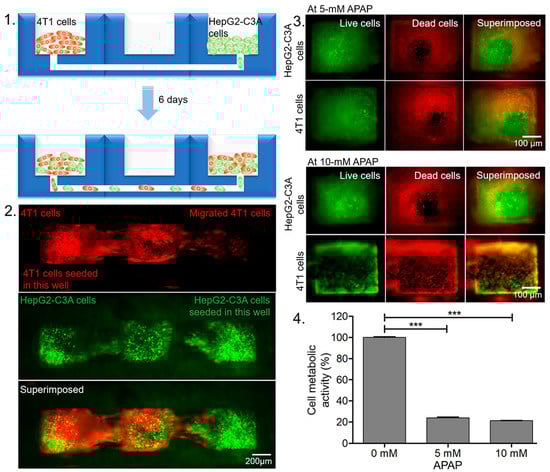 Results of coupled microwell experiments. 1. Schematic showing co-culture of 4T1 cells and HepG2-C3A cells in two microwells that are coupled by an underlying microfluidic channel. 2. Fluorescence micrographs showing cell migration after 6 days of culture. 3. Viability of HepG2-C3A and 4T1 cells in coupled microwells after APAP treatment showing the live (green) and dead (red) cells. 4. Quantitative metabolic activity of the cells measured using the MTS assay after treatment with indicated doses of APAP. The asterisks represent statistically significant differences (p < 0.05).
