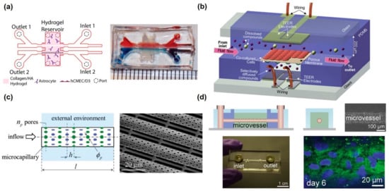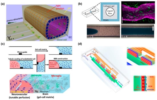 There have been in vitro BBB models with microfluidic devices in order to add similar functions of the in vivo BBB system. The actual BBB is positioned between blood flow and the neural tissue and prevents the transport of biomolecules. Thus, microfluidic flow with vascular endothelial cells should be essential to mimic the human BBB and its physiological functions. For the observation of barrier function and transcytosis of molecules, the BBBs were positioned in the middle of the channels and the divided channels were aligned horizontally or vertically. Prabhakarpandian et al. developed a simple microfluidics vasculature model of the BBB with a horizontal-aligned structure [43]. Two spaces, the apical and basolateral side were positioned horizontally and divided by the micropillar with 3 µm gap. At the apical side, vascular endothelial cells were maintained, and they blocked the FITC–dextran permeation from the apical side to the basolateral side. In this system, upregulation of tight junction proteins was observed by Western blot analysis of ZO-1 and claudin-1. Deosarkar et al. also exhibited a similar strategy, consisting of a tissue chamber at the center and a surrounding vascular channel for applying fluidic flow [44]. The authors claimed that the developed BBB chip not only allows for culturing of brain endothelial cells under shear flow that mimic the microvessels in vivo, but also permits interactions between the endothelial cells and astrocyte in the middle chamber. Partyka et al. showed a 3D model of the BBB, composed of two horizontal channels and a hydrogel reservoir at the center of the two channels [45] (Figure 2a). In this system, there were two specific functions that applied cyclic strain stimulation by the pressure and electrical system to measure the TEER value in situ. A pulsatile flow to the vessel channels induced pulsatile strain to the vascular wall, offering an opportunity to investigate stretch-induced transport. Through this platform, pulsatile wave facilitates retrograde transport of high molecular weight dextran along the basement membrane between the basal endothelium and astrocytes.