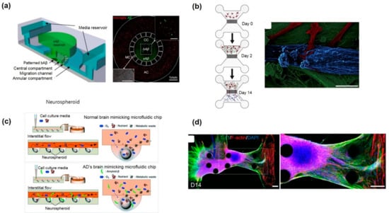 Neurological disorders (NDs), which are diseases of the central nervous system (CNS) and peripheral nervous system (PNS) such as Alzheimer’s disease (AD) and Parkinson’s disease (PD), have been on the increase whilst threatening the quality of life of affected individuals, especially the elderly, and their families [1,2,3,4,5]. There are many causes of NDs, but their origin and trigger have not yet been identified. Moreover, no therapeutic agents that can repair neural network damage caused during NDs in both CNS and PNS are available to date [6,7,8], although high costs and manpower have been invested in the development of new drugs. Therefore, development of effective drugs against each ND is urgently needed. In the drug development process, one of the significant factors is the development of effective drug-screening models, which would help lower costs and time. Generally, the main models for drug screening can be categorized into two systems: in vitro cell-based model and in vivo animal model. However, there are some critical limitations associated with using models as an alternative to an actual human system. The in vitro cell-based model has numerous gaps in comparison with an actual human biological system, such as bloodstream with an appropriated shear stress as well as a nutrient and oxygen delivery mechanism. Contrastingly, the in vivo animal model could not precisely emulate the human physiological system owing to species differentiation [9,10,11]. Moreover, there are severe ethical issues arising from the use of animals for screening drug candidates. Hence, a novel model platform is urgently warranted to enable the replacement of or overcome the shortcomings of both the aforementioned models.