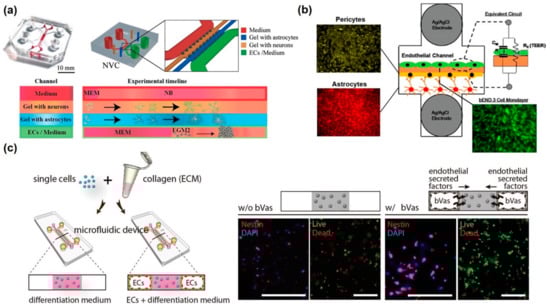 Some attempts have been made to use neuronal cells and endothelial cells that had been differentiated from stem cells for developing NVU. Appelt-Menzel et al. established in vitro NVUs using iPSCs and induced multipotent stem cells (iMSCs) [87]. The authors mentioned that the developed neurovascular model showed a TEER value of 2500 Ω·cm2 and upregulation of BBB-related genes. Additionally, tight junction proteins were found to be present, and a reduction in TEER value was confirmed by treatment with claudin-specific tight junction modulators. Thus, the abovementioned neurovascular model can be personalized to specific individuals using their respective cells. Canfield et al. also constructed an NVU model comprising isogenic endothelial cells, astrocytes, pericytes, and neurons differentiated from iPSCs [88]. Barrier tightening induced by iPSC-derived astrocytes and neurons indicates their BBB-inductive capacity. However, such aforementioned systems involve the application of stem cell-derived cells to a traditional Transwell system, which could not mimic fluidic flow. Shin et al. developed a 3D neurovascular model, which consisted of vascular endothelial cells and neural stem cells on a 3D collagen structure with a microfluidic device [89] (Figure 4c). This microfluidic platform comprising 3D ECM and endothelial cells can elicit spatiotemporal control of the neural stem cells by generating a gradient of chemical factors and maximizing paracrine- and autocrine-signaling effects. Consequently, vascular endothelial cells could regulate self-renewal and differentiation of neural stem cells. In detail, they suppressed neuronal generation but promoted differentiation into astrocytes and oligodendrocytes. Using this platform, it was possible to observe how stem cells inside an NVU released secretomes from endothelial cells. Campisi et al. emulated the microvascular structure in 3D self-organized endothelial cells and surrounding pericytes [90]. The iPSC-derived vascular endothelial cells underwent angiogenesis to the 3D hydrogel, where iPSC-derived pericytes and astrocyte were maintained. These neuronal cells formed an actual neurovascular network, comprising small lumens (approximately measuring 70 µm in diameter) and showing low permeability and transport selectivity. Moreover, gene expression of membrane transporters, tight junction, and extracellular matrix proteins, was similar to the in vivo neurovascular models with equivalent geometrical structures. Using these in vitro NVU models with BBB, it is possible to test certain biological events such as transcytosis, angiogenesis, and neuronal disorder development.