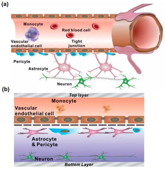 Adriani et al. exhibited an in vitro 3D neurovascular microfluidic model comprising the BBB and neurons for mimicking the neurovascular model [83] (Figure 4a). In this system, the channels of media, neurons, astrocytes, and endothelial cells were aligned horizontally, and two neuronal channels were made up of collagen, similar to the actual 3D neuronal structure. Neurons could be quantitatively analyzed in terms of neuronal responses with neurite outgrowth and neuronal activity, whereas endothelial cells form BBB and perform specific functions, such as size-selective permeability, similar to the existing in vitro BBB models. Nguyen et al. developed a hybrid elastomer–plastic microdevice using amine-functionalized poly(dimethylsiloxane) (PDMS) to mimic the human BBB in vitro [84]. In brief, poly-dopamine was functionalized on the amine-functionalized PDMS to provide a stable surface for culturing vascular endothelial cells and astrocytes. Using this platform, the authors showed four characters for verifying the formation of BBB, NVU, tight junctions, actin filaments as well as the expression of tight junction protein (ZO-1) and the low permeability of FITC–dextran molecules. As opposed to the monoculture model of endothelial cells, coculturing of astrocytes and vascular endothelial cells revealed greater integrity of BBB, as estimated TEER value measurements and permeability test results, as well as higher F-actin expression. Brown et al. successfully fabricated the in vitro NVU model consisting of vascular space and a 3D brain parenchyma site [85]. A filter membrane was positioned between these two channels, and crosstalk between pericyte–astrocyte and endothelial cells was enabled. The perfusion channel was presented on the brain parenchyma channel to supply nutrients and apply some biomaterials. This dual perfusion nature of this device allows for the manipulation of either side of the BBB as well as differential delivery of drugs and nutrients to either the vasculature or brain chamber. A similar structure and composition of the in vitro NVU was revealed, consisting of pericytes, astrocytes, and vascular endothelial cells [86] (Figure 4b). In situ measurement of the TEER value was successfully taken by inserting two independent electrodes into two separate microfluidic channels. As expected, the tri-culture model, which consisted of pericytes, astrocytes, and endothelial cells, showed the highest TEER value and lowest permeability. Additionally, P-gp efflux pump was functionally expressed on the endothelial cells of bi- and tri-culture models. However, development of in vitro NVU was limited using stable cell lines because immortalized cells do not exactly or equivalently mimic the functions of actual endothelial cells and neuronal cells.