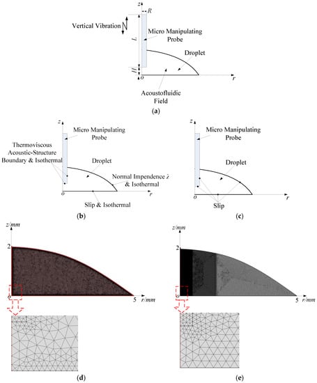 The meshed FEM models of the droplet-ultrasonic substrate system for the PM and RSM are shown in Figure 2d,e, respectively, in which the radius and height of the droplet are 5 mm and 2 mm, respectively.