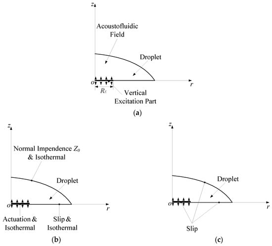A numerical model for the droplet-ultrasonic substrate system for micro/nanoscale particle concentration is illustrated in Figure 2a. The Thermoacoustics module is firstly utilized to compute the acoustic field by harmonically actuating the partial boundary of the fluid in the z direction. The acoustic and fluidic boundary conditions are shown in Figure 2b,c, respectively.