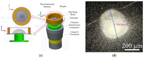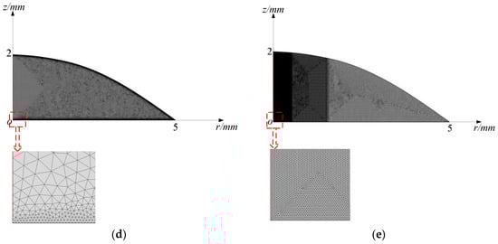 The meshed FEM models of the ultrasonic probe-droplet-substrate system for the PM and RSM are shown in Figure 1d,e, respectively, in which the radius and height of the droplet are 5 mm and 2 mm, respectively. The maximum element size of the MMP is set to be 5 μm (1/3 of the radius of the MMP when R = 15 μm) in the models.