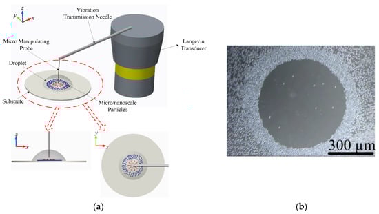 In order to experimentally verify the FEM simulation results, an ultrasonic probe-droplet-substrate system for micro/nanoscale particle removal at the droplet-substrate interface is constructed. The experimental microscale particles (yeast cells, Angel Yeast Co., Ltd., Yichang, China) and nanoscale particles (Si nanoparticles, SiNPs, Beijing DK Nano Technology Co., Ltd., Beijing, China) have the average diameters of 4 μm and 400 nm, respectively. As shown in Figure 3a, the vibration transmission needle (VTN), which is made of nickel-plated steel (Shanghai Dongfeng Co., Ltd., Shanghai, China), is bonded to the radiation surface of a Langevin transducer (Suzhou Hainertec Co., Ltd., Suzhou, China), which vibrates with the piston mode []. Thus, the VTN can vibrate flexurally in the z direction. The MMP with the radius R and length L, which is made of glass fiber (Nanjing Fiberglass Research & Design Institute Co., Ltd., Nanjing, China), is bonded to the tip of the VTN, and thereby vibrates in the z direction with the vibration velocity amplitude Vpvib. The MMP is inserted into the droplet of micro/nanoscale particle suspension on a silicon substrate (Zhejiang Lijing Co., Ltd., Hangzhou, China), and the distance between the MMP’s tip and substrate surface H is controlled by the manual X-Y-Z moving stage (LD125-LM-2, Shengling Precise Machinery Co., Ltd., Dongguan, China). The maximum height and radius of the droplet are 2 mm and 5 mm, respectively. The driving voltage for the device is sinusoidal, and the device works at its resonance frequency fp. Figure 3b shows the stable removal effect of yeast cells when R = 15 μm, L = 4 mm, Vpvib = 0.3 m/s, H = 50 μm and fp = 40 kHz (the concentration of the yeast cell suspension is 1.38 mg/mL).