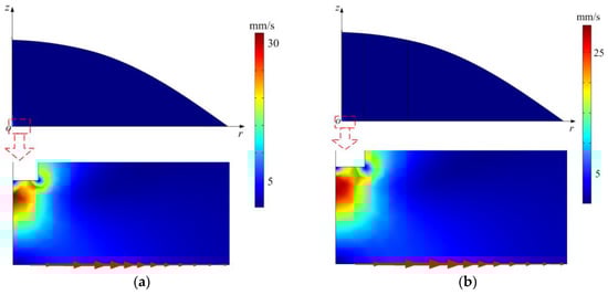 The simulated acoustic streaming fields in the droplet-ultrasonic substrate system for micro/nanoscale particle concentration by the PM and RSM are shown in Figure 10a,b, respectively, from which it is seen that there exist vortices in the droplet. At the droplet-substrate interface, as the acoustic streaming flows from the outside boundary of the droplet to point o, micro/nanoscale particles can be dragged to point o, and be concentrated in the central area (Figure 3c). Finally, the stable concentration diameter (SCD) of aggregation of micro/nanoscale particles can be reached.