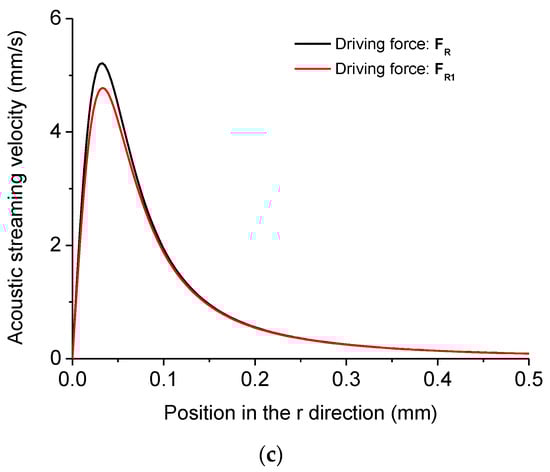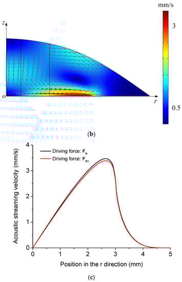 Compared with the expression of components of FR in the 2D rectangular coordinate system [], nonlinear terms and are generated in Fr and Fz, respectively. Herein, to investigate the effect of these nonlinear terms on the acoustic streaming fields, we define the driving force of acoustic streaming without the nonlinear terms as FR1, and the components of FR1 are expressed as