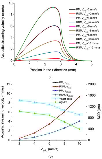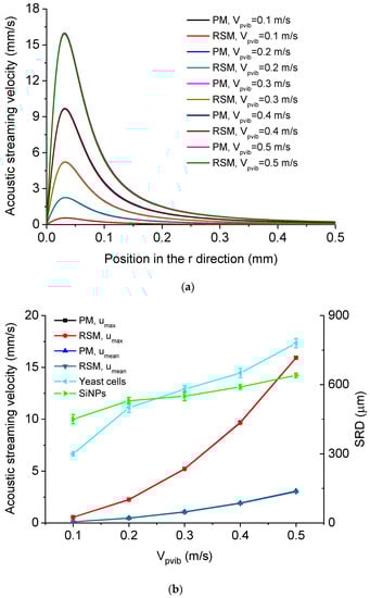 The dependency of acoustic streaming velocity on the vibration velocity amplitude of the MMP Vpvib is shown in Figure 5. Figure 5a shows the distribution of acoustic streaming velocity along the r direction at the droplet-substrate interface computed by the PM and RSM under different Vpvib. It is seen that the acoustic streaming velocity firstly increases with the increase of r and then reaches umax, after which the acoustic streaming velocity decreases with the increase of r and tends to 0 when r = 0.5 mm. Figure 5b shows umax, umean and experimentally measured SRD of the cleaned area for yeast cells and SiNPs versus Vpvib. In Figure 5b, Vpvib was controlled by changing the input power of the device (Figure 3a), and the standard deviation is obtained by five times of experimental measurements. It is seen that both umax and umean increase with the increase of Vpvib, which accounts for that the SRD increases with the increase of Vpvib. In this case, one can realize the pinpoint or relatively large-area removal of micro/nanoscale particles [] by easily tuning the input power of the device. Meanwhile, in Figure 5b, both umax and umean computed by the PM are always larger than those computed by the RSM when Vpvib is the same. To quantitatively demonstrate the deviation of acoustic streaming velocity computed by the PM and RSM, we define the deviation as