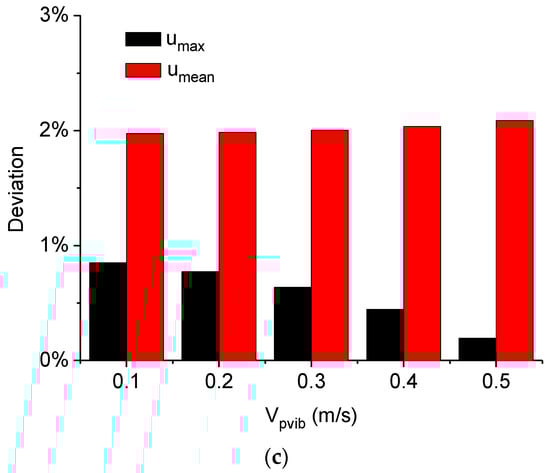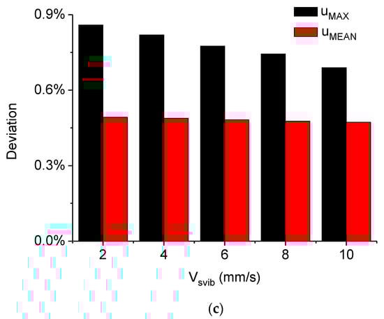 Obviously, it is seen from Equation (27) that the difference of driving force of acoustic streaming between the PM and RSM is , and we define it as Fadd. The reason for that D of umax decreases with the increase of Vpvib may be that as Vpvib increases, i.e., the input power for the acoustic field increases, Fadd becomes less important compared to the main driving force of acoustic streaming (FR) in this system.