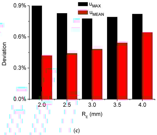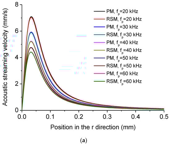 where uR is the acoustic streaming velocity magnitude at the r position. From Figure 10c, the deviations for uMAX and uMEAN are calculated to be 2.32% and 2.59%, respectively. Therefore, the nonlinear terms in FR are also non-negligible for simulating acoustic streaming fields in the droplet-ultrasonic substrate system by the RSM.