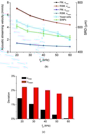 The dependency of acoustic streaming velocity on the driving frequency of the system fp is shown in Figure 6. Figure 6a shows the distribution of acoustic streaming velocity along the r direction at the droplet-substrate interface computed by the PM and RSM under different fp. Figure 6b shows umax, umean and experimentally measured SRD of the cleaned area for yeast cells and SiNPs versus fp. In Figure 6b, the SRD versus fp was measured with five Langevin transducers with different resonance frequencies (20 kHz, 28 kHz, 40 kHz, 51 kHz, 60 kHz). It is seen from Figure 6b that both umax and umean decrease with the increase of fp, which accounts for that the SRD decreases with the increase of fp. This result indicates that the lower driving frequency is beneficial to removing micro/nanoscale particles within larger areas. Figure 6c shows D of umax and D of umean versus fp, respectively, and it is seen that D of umax decreases with the increase of fp. This is because that although Vpvib is kept the same, the higher input frequency corresponds to the higher input power for the acoustic field [], in which case Fadd becomes less significant compared to FR when fp increases in this system.