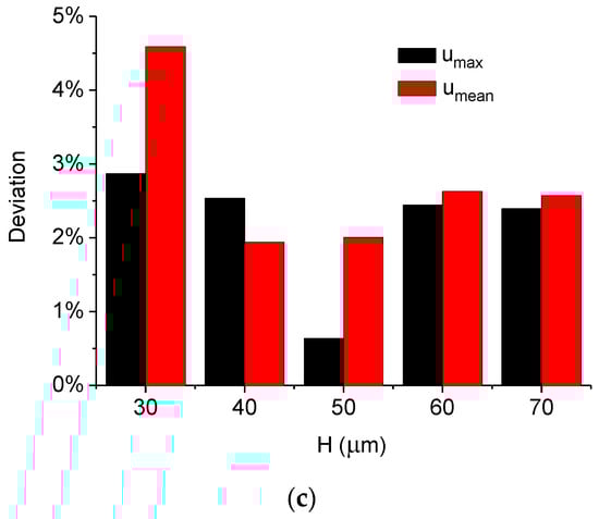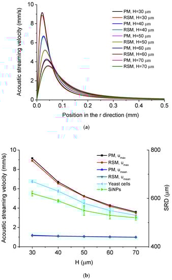 The dependency of acoustic streaming velocity on the distance between the MMP’s tip and substrate surface H is shown in Figure 7. Figure 7a shows the distribution of acoustic streaming velocity along the r direction at the droplet-substrate interface computed by the PM and RSM under different H, from which it is seen that the position where umax occurs moves outwards from point o when H increases. Figure 7b shows umax, umean and experimentally measured SRD of the cleaned area for yeast cells and SiNPs versus H, from which it is seen that both umax and umean decrease with the increase of H, which accounts for that the SRD decreases with the increase of H. In this case, one can realize the pinpoint or relatively large-area removal of micro/nanoscale particles just by tuning the distance between the MMP’s tip and substrate surface through controlling the X-Y-Z moving stage. Figure 7c shows D of umax and D of umean versus H, respectively, and it is seen that D of umax is in the range of 0.6% to 2.9%, while D of umean is in the range of 1.9% to 4.6%.