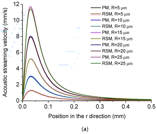 In this work, numerical simulations of acoustofluidic fields are carried out by the commercial FEM software COMSOL Multiphysics 5.3a (Burlington, MA, USA). The computational process consists of the following two steps. In the first step, acoustic field, which mainly includes the acoustic velocity field and acoustic pressure field, is computed according to the external actuation conditions and acoustic boundary conditions. In the second step, with the computed result of acoustic field, the acoustic streaming field is computed according to the fluidic boundary conditions. For the PM, the right-hand side of Equation (10) is included as a source term by adding a so-called weak contribution to the governing equations, and Equation (12) acts as a body force term. For the RSM, Equations (20) and (21) act as the body force terms in the r and z directions, respectively. More detailed descriptions of the FEM models will be shown in Section 3.