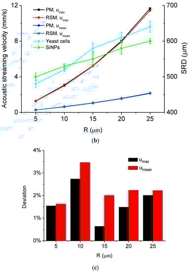 The dependency of acoustic streaming velocity on the radius of the MMP R is shown in Figure 8. Figure 8a shows the distribution of acoustic streaming velocity along the r direction at the droplet-substrate interface computed by the PM and RSM under different R. Figure 8b shows umax, umean and experimentally measured SRD of the cleaned area for yeast cells and SiNPs versus R, from which it is seen that both umax and umean increase with the increase of R, which results in that the SRD increases with the increase of R. This result indicates that the removal effect of micro/nanoscale particles can be controlled by using MMPs with different radii. Figure 8c shows D of umax and D of umean versus R, respectively, and it is seen that D of umax is in the range of 0.6% to 2.8%, while D of umean is in the range of 1.6% to 3.5%.