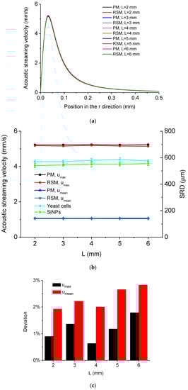 The dependency of acoustic streaming velocity on the length of the MMP L is shown in Figure 9. Figure 9a shows the distribution of acoustic streaming velocity along the r direction at the droplet-substrate interface computed by the PM and RSM under different L, from which it is seen that the distribution of acoustic streaming velocity changes little when L varies. Figure 9b shows umax, umean and experimentally measured SRD of the cleaned area for yeast cells and SiNPs versus L, from which it is seen that umax, umean and the SRD change little when L changes. This is because that the vibration of the MMP’s portion outside the droplet does not affect the acoustofluidic field within the droplet (Figure 1a and Figure 3a). As a result, it can be known that L has little influence on the removal effect of micro/nanoscale particles at the droplet-substrate interface in this system. Figure 9c shows D of umax and D of umean versus L, respectively, and it is seen that D of umax is in the range of 0.6% to 1.8%, while D of umean is in the range of 1.9% to 2.9%.