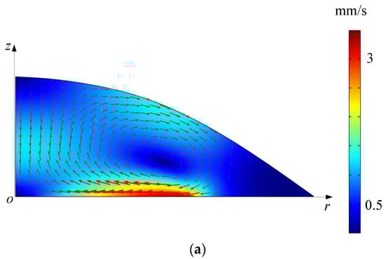 where ur is the acoustic streaming velocity at the r position. From Figure 4c, the deviations for umax and umean are calculated to be 8.66% and 5.3%, respectively. Therefore, the nonlinear terms in FR are non-negligible for simulating acoustic streaming fields in the ultrasonic probe-droplet-substrate system by the RSM.