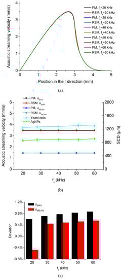 The dependency of acoustic streaming velocity magnitude on the driving frequency of the system fs is shown in Figure 12. Figure 12a shows the distribution of acoustic streaming velocity magnitude along the r direction at the droplet-substrate interface computed by the PM and RSM under different fs, from which it is seen that the distributions of acoustic streaming velocity magnitudes change little when fs varies. Figure 12b shows uMAX, uMEAN and experimentally measured SCD of aggregation of yeast cells and AgNPs versus fs. In Figure 12b, the SCD versus fs was measured with five Langevin transducers with different resonance frequencies (20 kHz, 28 kHz, 40 kHz, 51 kHz, 60 kHz). It is seen from Figure 12b both uMAX and uMEAN change little when fs varies, which accounts for that the SCD changes little when fs varies. Therefore, it can be known that the driving frequency of the device has little influence on the concentration effect of micro/nanoscale particles at the droplet-substrate interface in this system. Figure 12c shows D of uMAX and D of uMEAN versus fs, respectively, from which it is seen that D of uMAX increases with the increase of fs. This may result from that when fs increases, Fadd (generated from the time average of the partial derivative of −ρ1u1 with respect to time) becomes more important compared to the main driving force of acoustic streaming (FR) in this system.