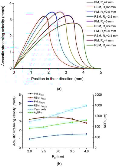 The dependency of acoustic streaming velocity magnitude on the radius of excitation part RE is shown in Figure 13. Figure 13a shows the distribution of acoustic streaming velocity magnitude along the r direction at the droplet-substrate interface computed by the PM and RSM under different RE, from which it is seen that the position where uMAX occurs moves outwards from point o when RE increases. Figure 13b shows uMAX, uMEAN and experimentally measured SCD of aggregation of yeast cells and AgNPs versus RE. In Figure 13b, the SCD versus RE was measured with VTCs with different radiation heads’ radii (Figure 3c). It is seen from Figure 13b that uMAX firstly increases with the increase of RE and then decreases with the increase of RE, while uMEAN increases with the increase of RE. It is also seen from Figure 13b that the SCD increases with the increase of RE. This may result from that when RE increases, the coverage area of the inward acoustic streaming flow increases (Figure 13a), which is beneficial to concentrating micro/nanoscale particles within larger areas. Figure 13c shows D of uMAX and D of uMEAN versus RE, respectively, and it is seen that the D of uMAX is in the range of 0.77% to 0.92%, while D of uMEAN is in the range of 0.41% to 0.65%.