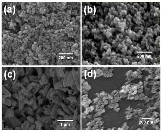 Microstructures of the four gas-sensing materials: (a) Pd-doped SnO2; (b) In2O3; (c) Ru-doped WO3; (d) Pd-doped SnO2-ZnO.
