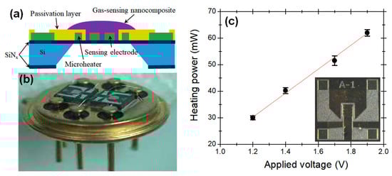 Physical characterization of the fabricated dual-sensor module: (a) cross-sectional view of the arrayed gas-sensor package, (b) photograph of a dual-sensor module, (c) output power vs. applied voltage curve of the microheater.