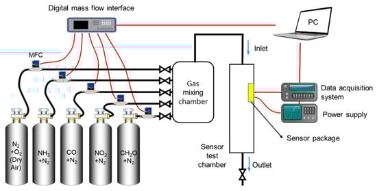 A schematic diagram of a MOS sensor analysis system used in this study is shown in Figure 3. The analysis system mainly consists of a test chamber where the fabricated gas-sensor was placed, a control and data acquisition system, and a gas feeding system. Before measurements, a gaseous atmosphere in the test chamber with 2 L volume was maintained by flowing dry compressed air (N2 + O2) at a constant rate of 500 mL∙min−1, and then the micro-heater of the fabricated gas-sensor was heated at the optimized operating temperatures until a stable baseline was achieved. After that, the sensors in the chamber were exposed to an ambient gas flow composed of binary mixture gases and dry compressed air. The exposure time to a binary mixture gas and dry air was set up as 10 min, after which only dry air continuously flew to remove a binary mixture gas in the test chamber.